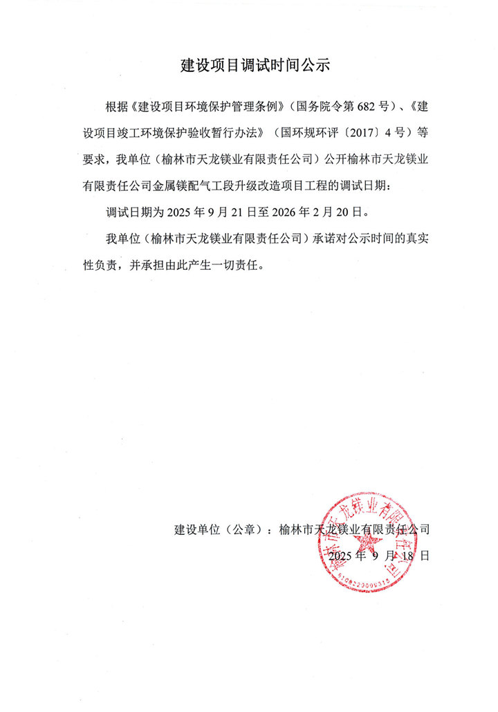 天龙镁业金属镁2.25万吨、兰炭50万吨验收公示